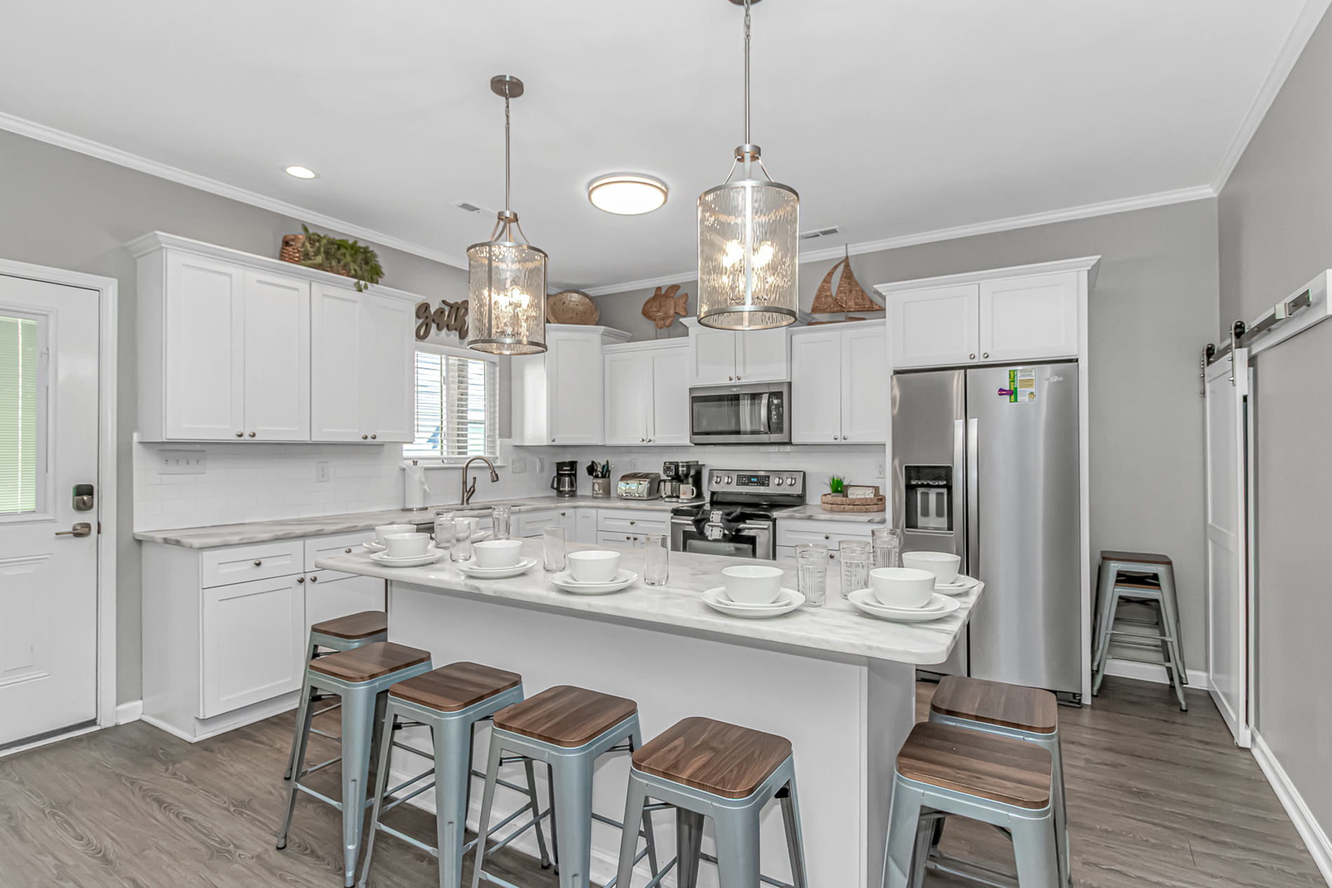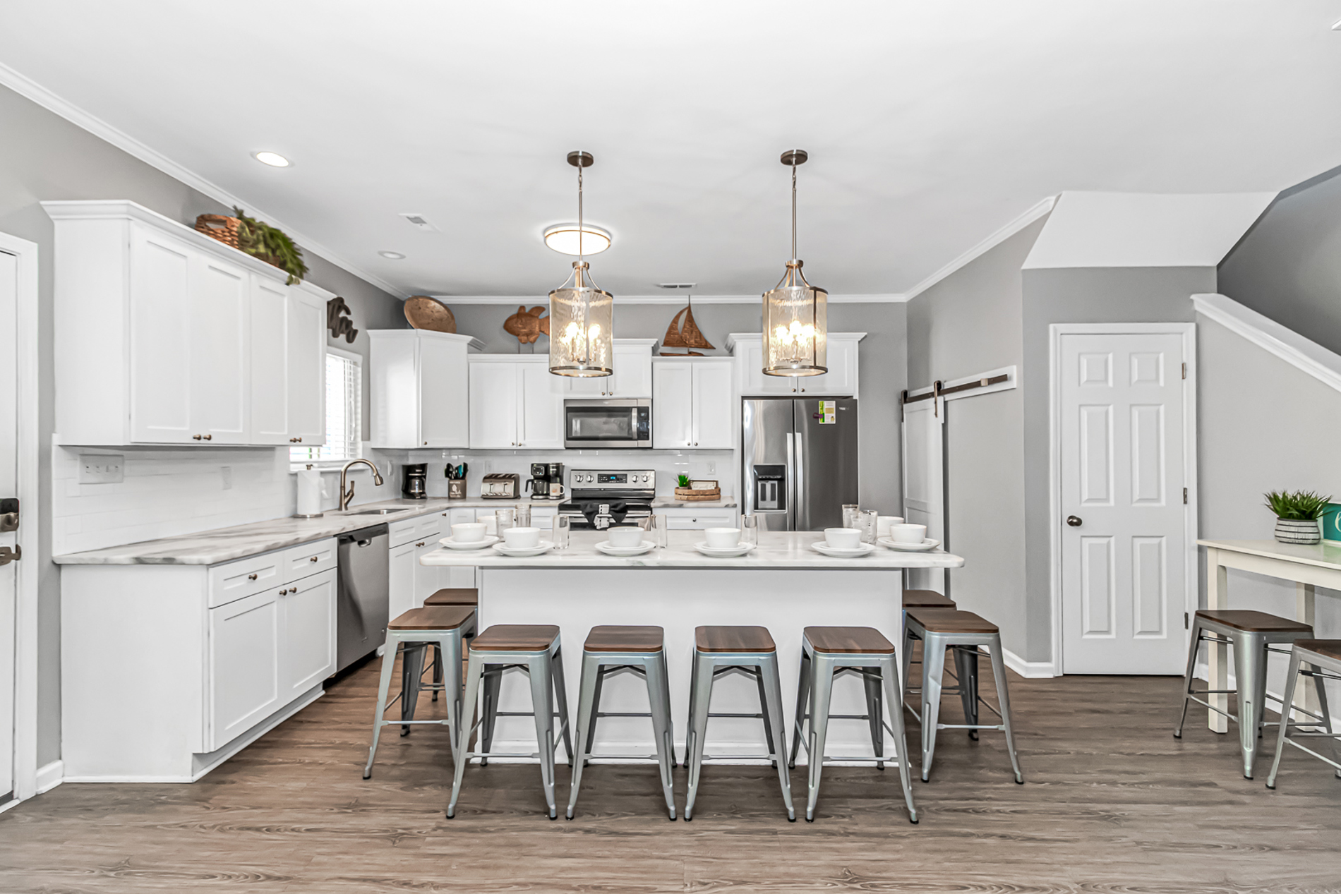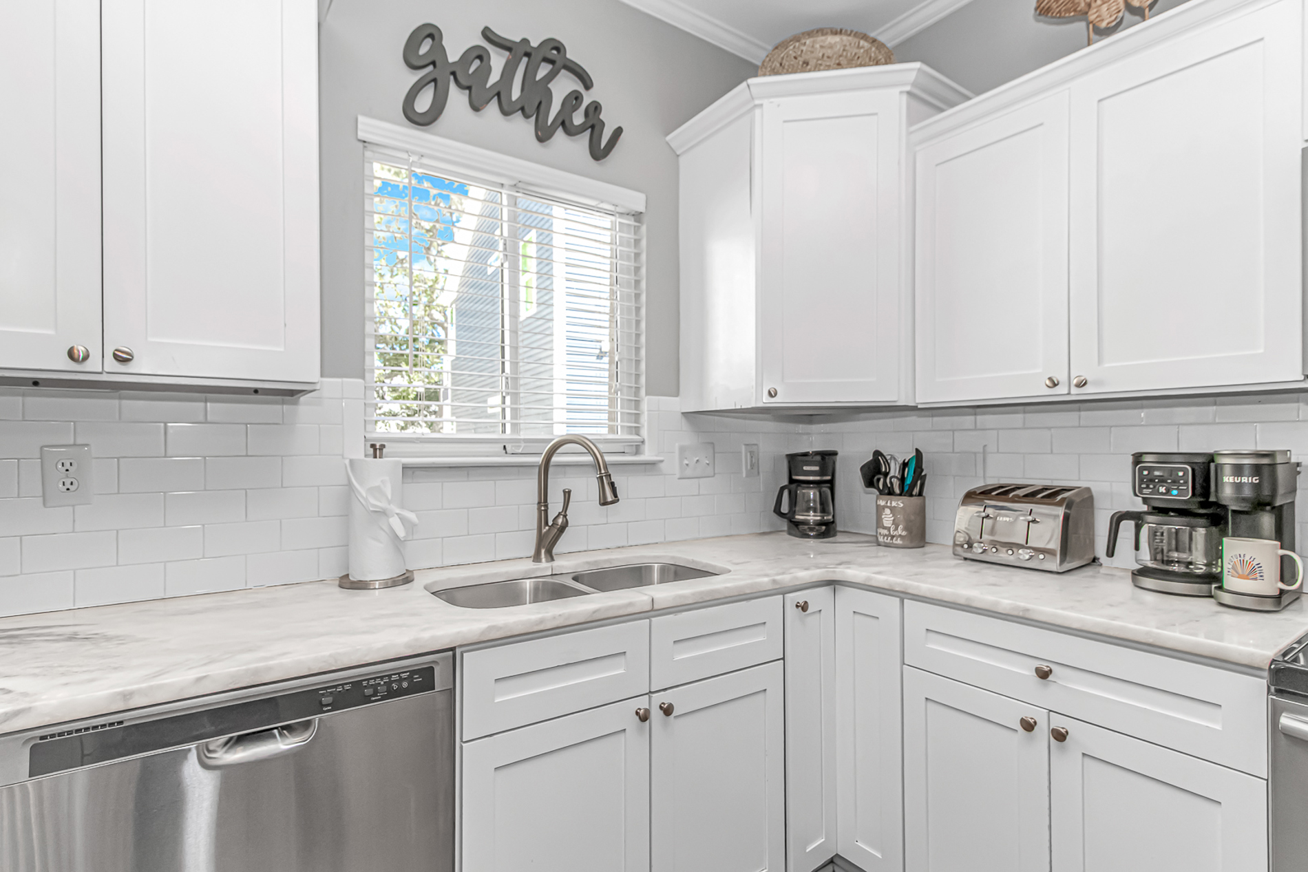 You will be greeted with a fully functional kitchen with all the accessories you would need on your vacation including: Coffee Pot and Keurig, dishwasher, oven, microwave, and of plenty of pots and pans.