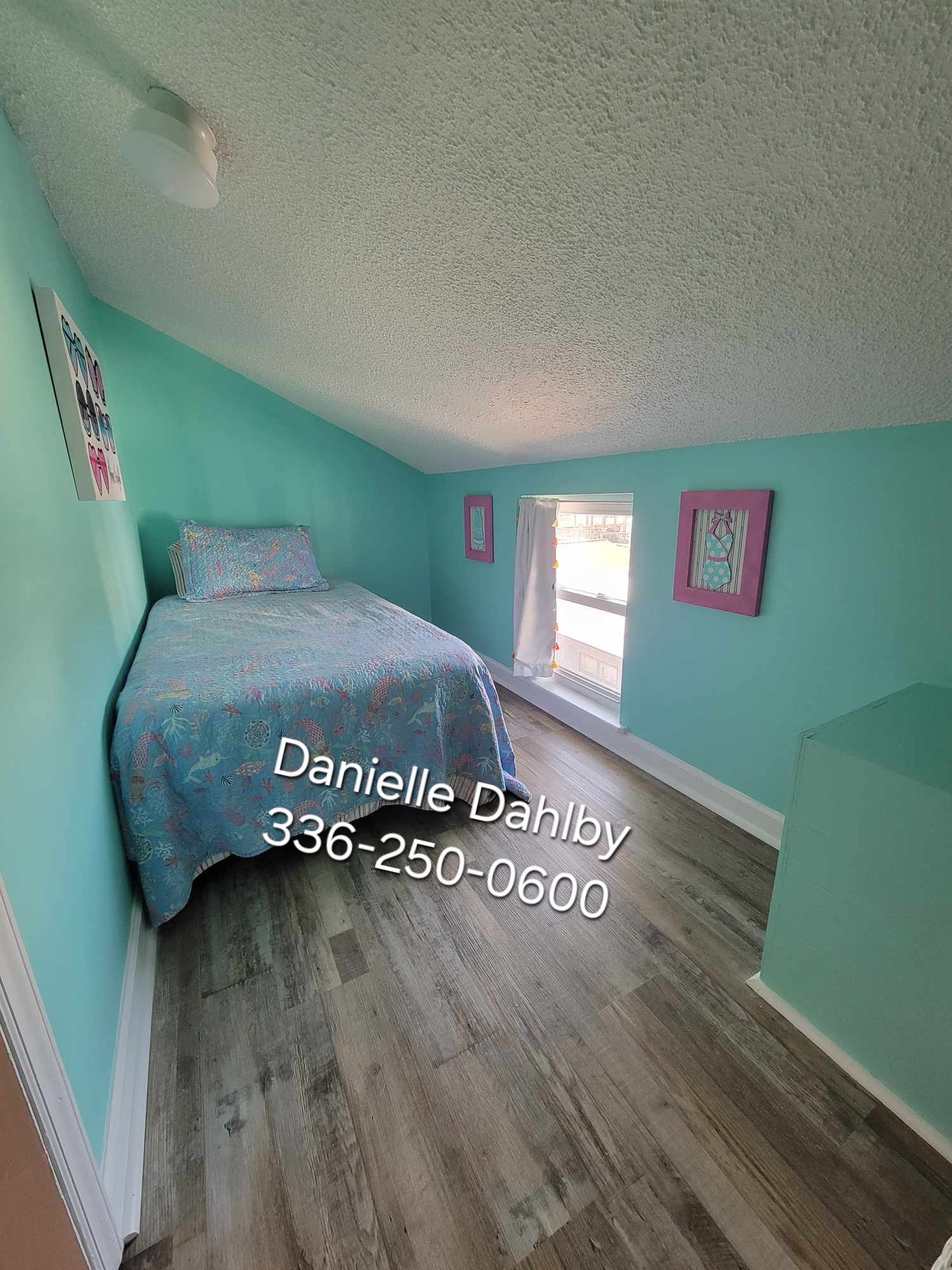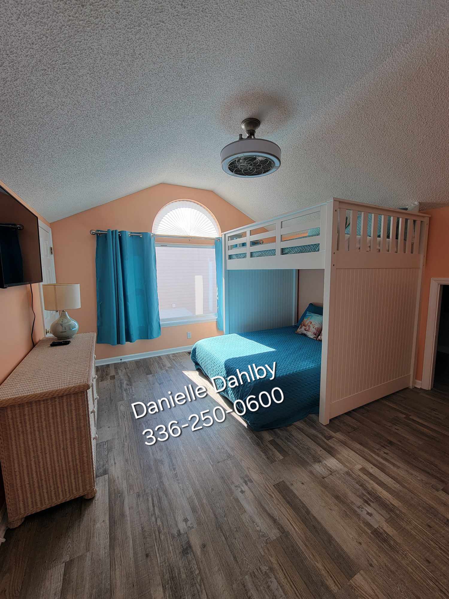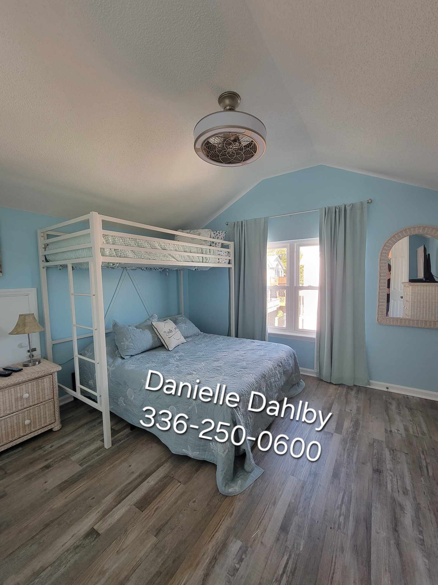 The master bedroom is located on the main floor and has a king size bed. There is also a rollaway twin bed located in the closet. There is a full bathroom on the main floor. It has a full shower/tub combo. Bedroom two is located on the 2nd floor and has a full loft bed (adult size with a weight limit of 400) over a queen bed. This bedroom also has a kid's nook area off of it that offers a twin bed, a chalk board and books for children to enjoy. Bedroom three, also located upstairs, has a twin loft bed (adult size, 300lb limit) over a queen bed.
