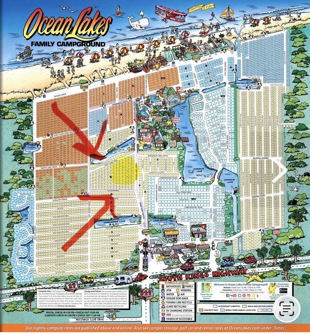 Located in the “N” !section right across from the Sandy Mart in the middle of the park close to all amenities is your cozy, family-friendly escape right inside Ocean Lakes Family Campground!