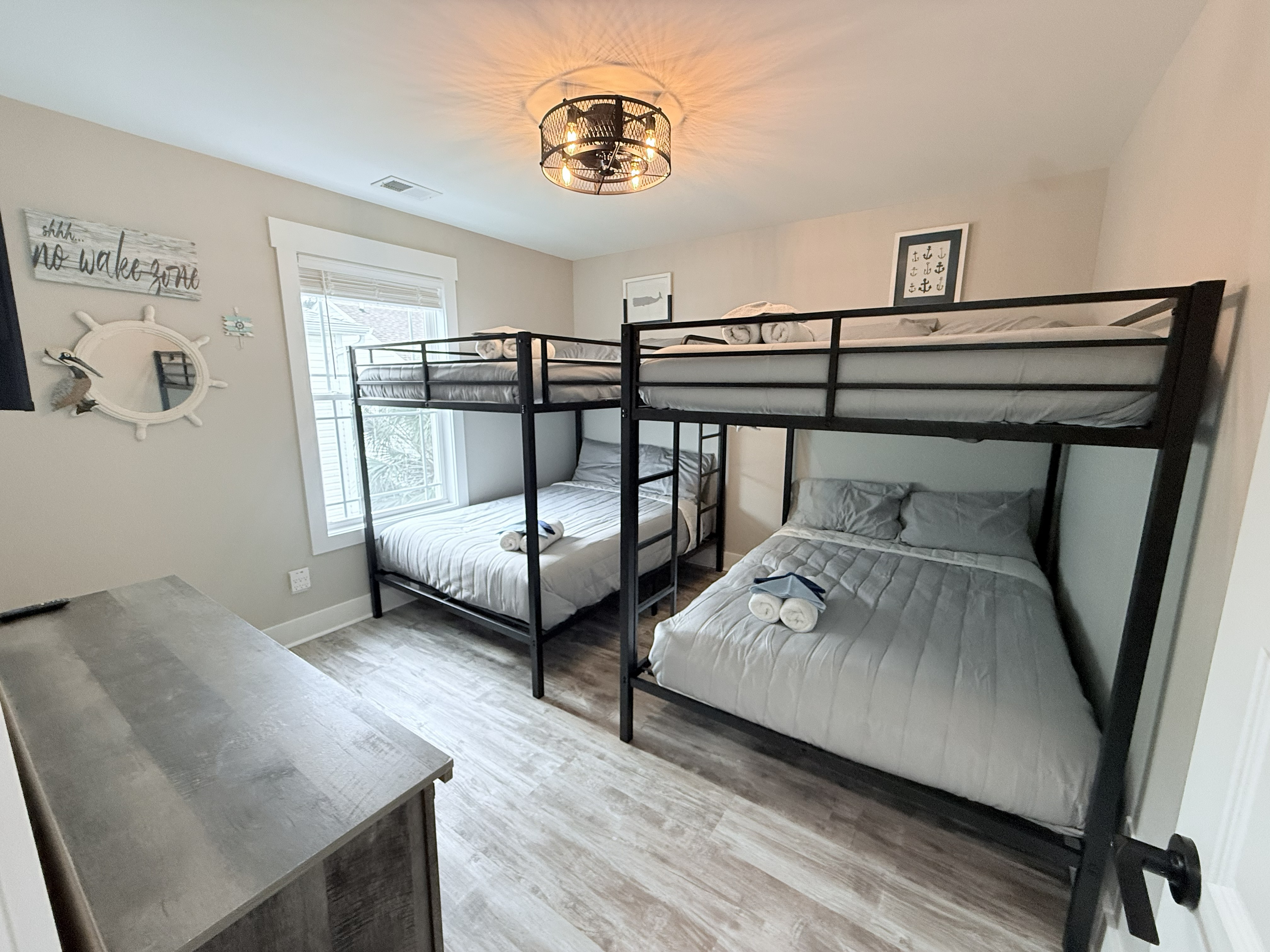 Comfortable Sleeping for up to 16 guests – 2 King Beds, 2 Queen Beds, 2 full over full bunk beds. Pack and Play, portable baby seat and baby monitor included. Plush beds, quality linens included in cleaning fee, and privacy for all
