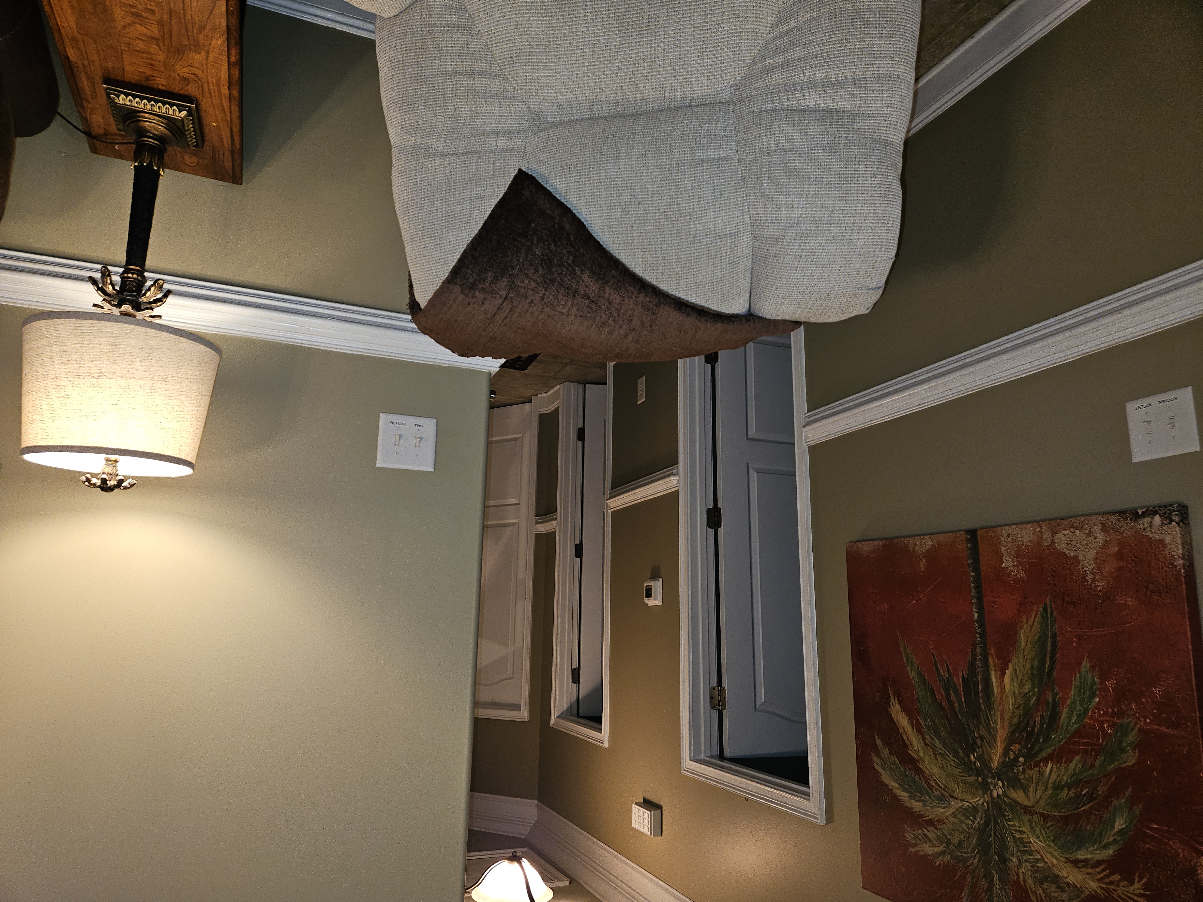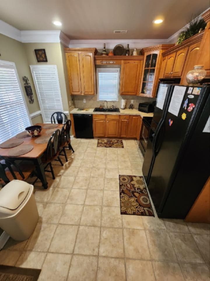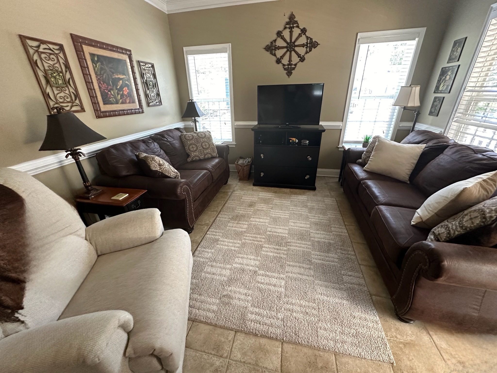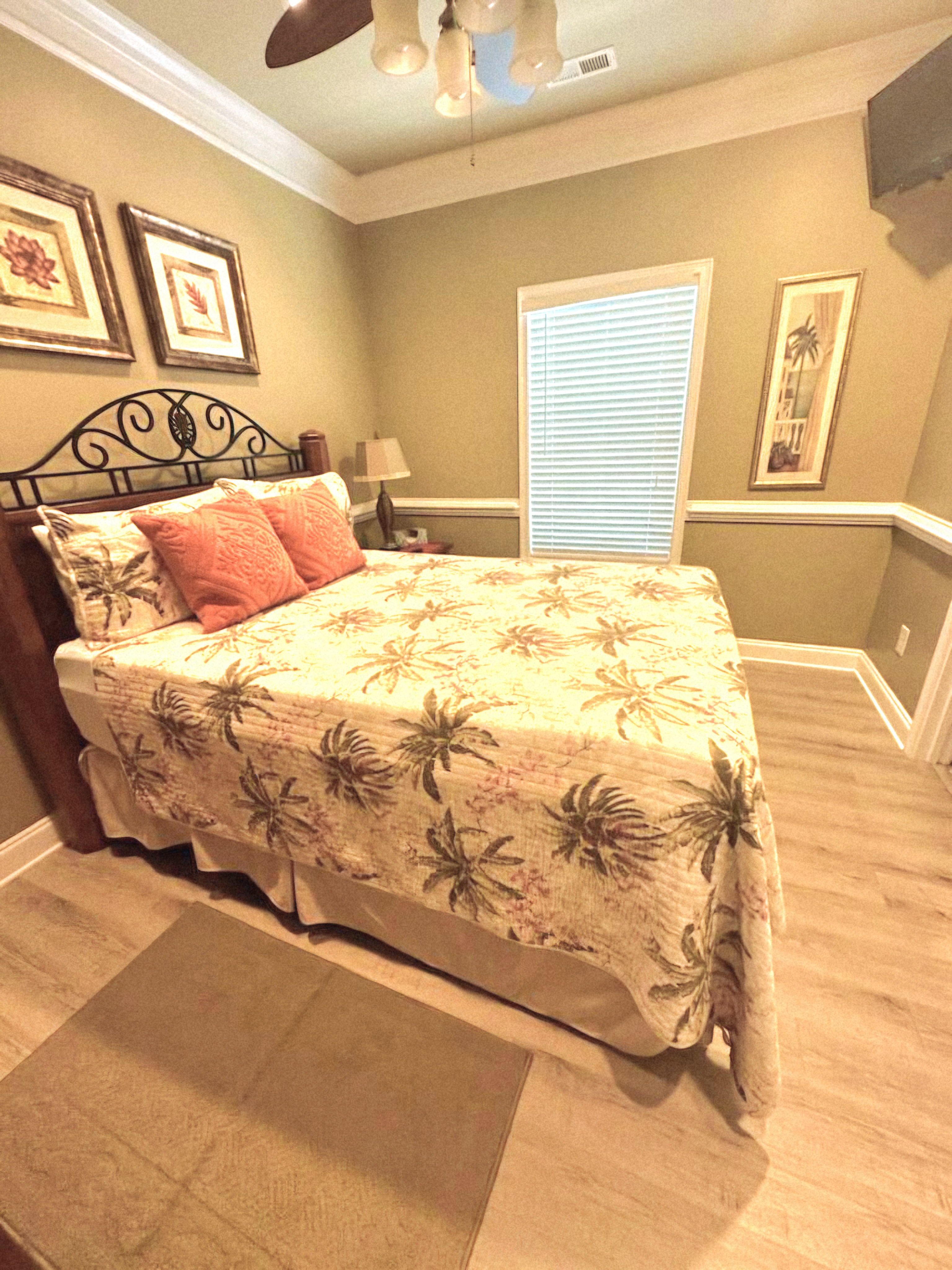 The living area is equipped with a standard sofa, love sofa, recliner and new flat screen TV/ DVD. It has a fully equipped kitchen with tiled counter-tops and maple cabinets. The tiled flooring is accented with new luxury vinyl laminate in the bedrooms, nine feet ceilings and chair railing adds unique character to this property.